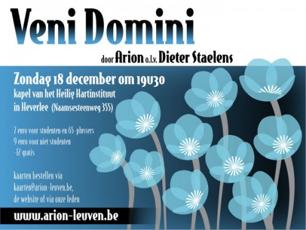 Op zondag 18 december 2011 hield Arion zijn eerste concert, genaamd ‘Veni Domini‘. Het concert vond plaats in de kapel van het Heilig Hartinstituut in Heverlee, waar Arion ook repeteert. Als eerste concert werd er gekozen voor een kerstconcert. Arion zong een afwisselend repertoire met werken van Vincent Lübeck, Felix Mendelsohn, Kurt Bikkemberg en Johann Michael Haydn. Solisten waren Elien, Lieve, Ines, Katrien en Hannelore.