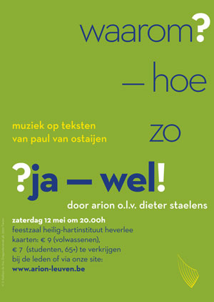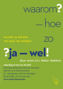 Het tweede concert van Arion was een feit op 12 mei 2012. Deze keer kozen we voor een uitsluitend Nederlandstalig repertoire, gebaseerd op teksten van Paul van Ostajien. Op het programma stond werk van Daan Manneke, Sebastiaan van Steenberge, Willem Kersters, Vic Nees en nog enkele andere Vlaamse componisten. Waar nodig werd Arion begeleid door Annelynn op piano. Het concert ging door in de kapel in het Heilig Hartinstituut in Heverlee.